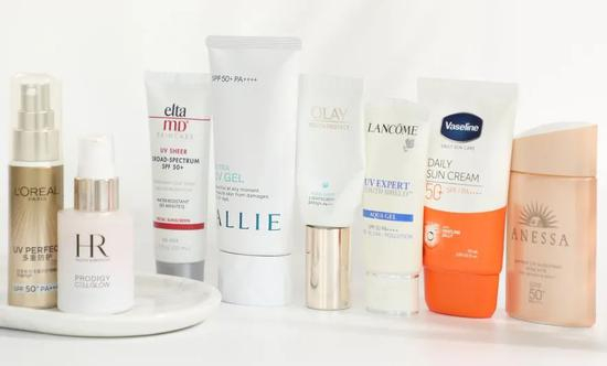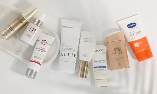 从左至右依次是:欧莱雅小金管、赫莲娜高光防晒、EltaMD隔离防晒、ALLIE倍护防晒、OLAY小白伞、兰蔻小白管、凡士林防晒、安热沙粉金瓶