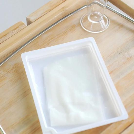 因为它是干面膜,使用方法比较特别,需要自己倒入20ml纯净水,再等待1分钟,等它变成沾满精华液的湿面膜,就可以上脸啦~