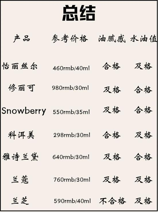 兰蔻、科洱美、兰芝和怡丽丝尔的水油值虽然稍微逊色一些,但也没有拉开太大的差距,像兰蔻的水份值49%,油份值18%的表现力也很奈斯。