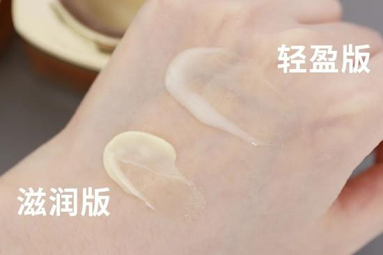 轻盈版的质地像果冻一样,推开之后一下子就化成了水,轻薄的同时,滋润度一点也不差!非常适合油皮、混油的姐妹夏天使用!