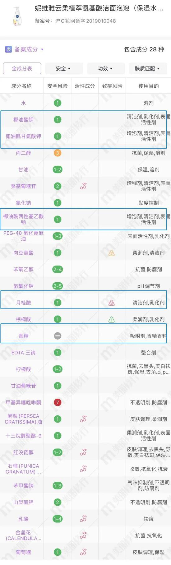 妮维雅的这款洁面在某成分app上的评价着实让我吓了一跳,它虽然属于氨基酸类的洗面奶,不过里面的确是有低含量的皂基,所以有人反馈用完后皮肤干,亦或是有些刺激的现象。如果你是个重敏肌的话,需要谨慎使用。