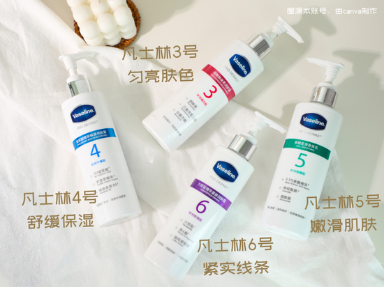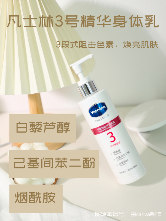 可别不相信,在身体乳这一块,凡士林可是专业的,有一整套精华身体乳。凡士林3号主打3段式阻击色素,焕亮肌肤,超级适合“小黄人”们~