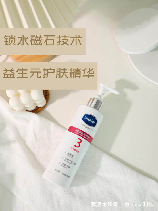 再加上凡士林精华身体乳都含有的锁水磁石技术和益生元护肤精华,帮助激活身体自身的保湿因子,加乘长时间保湿的同时维持水润清爽的质感;另一方面,益生元护肤精华像是给肌肤喝的养乐多,在促进肌肤表面有益菌群生长方面很赞,助力维持稳定的肌肤大环境。