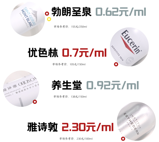 *实际瓶身粗壮度:依泉>勃朗圣泉、雅漾、理肤泉>优色林、雅诗敦、养生堂、伊肤泉