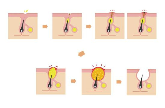 两种情况都会导致废旧角质在毛囊皮脂腺的导管里大量堆积,最终堵塞导管。多余的油脂不能得到清洁,经过氧化以及被微生物附着,就形成了痘痘。(根本上还是角质异常堆积导致油脂分泌过剩)