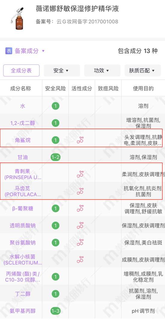 薇诺娜家这款精华不仅有角鲨烷和透明质酸钠等等保湿界的人气成分担起补水滋润的重任,更有青刺果提取物和马齿苋提取物这两个薇诺娜家的门面来起到舒缓皮肤不适的作用。