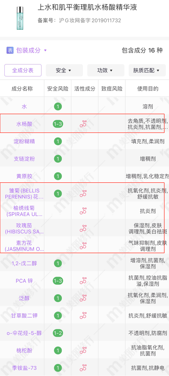 除了水杨酸,负责舒缓的雏菊花提取物、玫瑰茄花提取物等植萃成分,也能一定程度上稳住水杨酸的火爆脾气,配方相对其他酸类精华液来说比较温和,日常刷酸get它就可以!