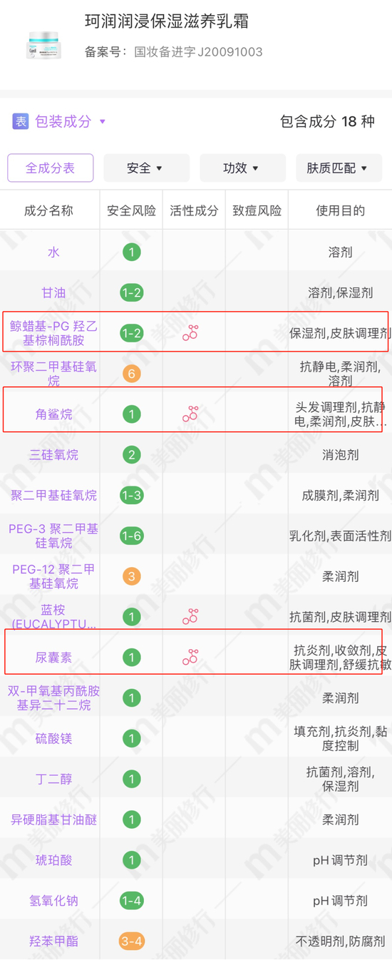 珂润面霜主打保湿滋养,所以角鲨烷和神经酰胺(鲸蜡基-PG羟乙基棕榈酰胺)当之无愧的挑大梁成分,负责为角质层补充水分,起到修护锁水的作用。成分中不含致痘成分,是油痘肌也可以放心使用的一款面霜~