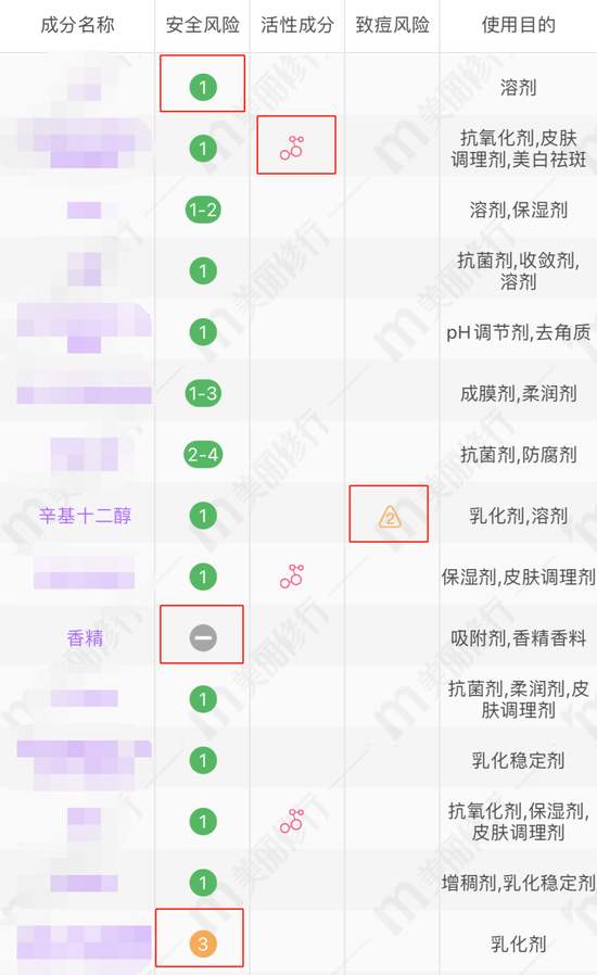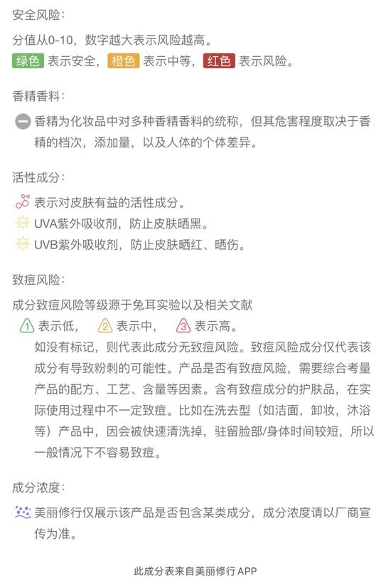 方法也简单,打开美丽修行APP/透明标签APP/真我APP。。。在成分表中找到对应的标识,就能判断护肤品致痘风险的高低啦~