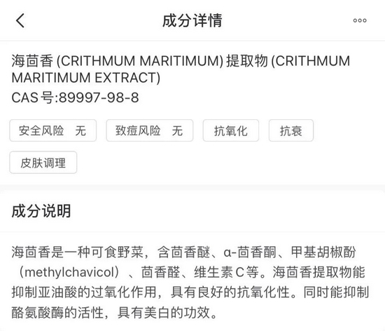 而成分表中,成分是不能使用修饰语的,比如下图的海茴香提取物,就只能写“xxx提取物”,不能在前面加天然、有机等修饰语。如果写了的,是不合规的,不要买。