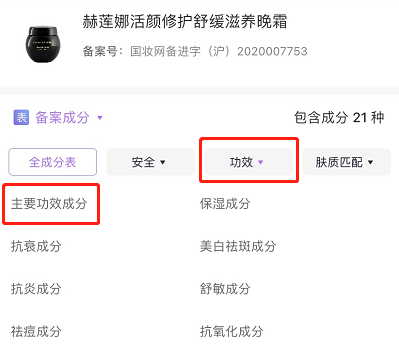 然后选择[功效]一栏,这时会出现不同功效的成分选项,先选择[主要功效成分]。