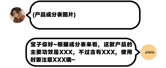 正确的询问方式应该是这样的:给出产品名、成分表,再加上成分查询四个字,酱酱就能秒懂啦。如无意外,工作日当天的成分查询,在下午六点半左右就能收到酱酱的回复啦~