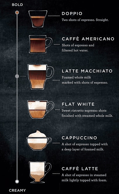 浓缩、拿铁、美式、摩卡、卡布奇诺、星冰乐。。。。。。 除了这些熟悉的种类,其实还有鸳鸯、阿芙佳朵(当浓缩咖啡撞上冰淇淋)、咖啡欧蕾、卡瑞托咖啡等其他种类,各个地区也有自己不同的的咖啡文化。