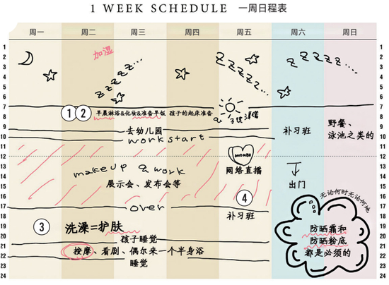 每天一早起来时的肌肤和头发的状态,往往就能决定这一天你的妆容是否持久,发型是否得体。因为早上往往都要照顾孩子没有时间,所以这些护理的工作只能留在晚上进行。只要肌肤状态好,就能省掉诸如遮瑕之类的化妆步骤。当然每个月去一到两次理发店,以及做几次皮秒也是必不可少的。