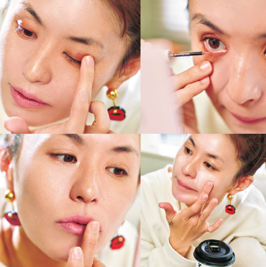 先使用带有提亮效果的UV底霜,再继续打上粉底。眼妆和唇妆都是用指腹即可完成上妆。在瞳孔下方点缀上亮片,成熟中又不失可爱。