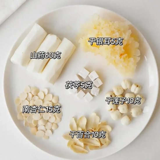 食材:山药10g,百合10g,莲子10g,茯苓10g,南杏仁30g