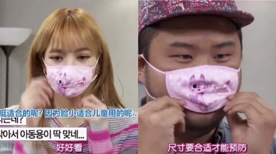 来品品我们粉墨天团Lisa早期综艺时,与男嘉宾一起试戴儿童口罩的效果。直观的感受到了我和女明星的差距。。。