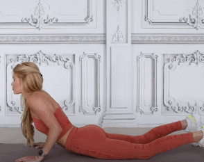 俯卧在瑜伽垫上,腿部完全贴紧地面,双手将上半身撑起,用力拉伸腹部。