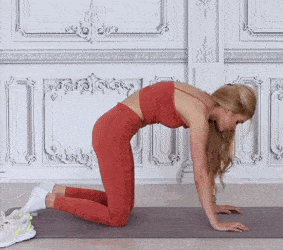 俯撑在瑜伽垫上,双手双膝着地。供起上背部、低头;胸部下沉到最低,仰头;全身放松。