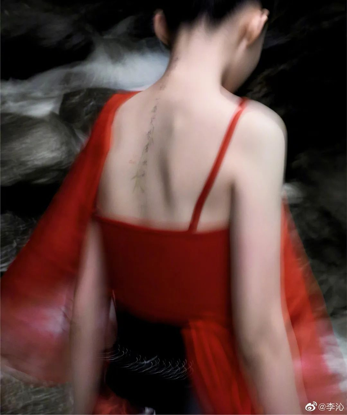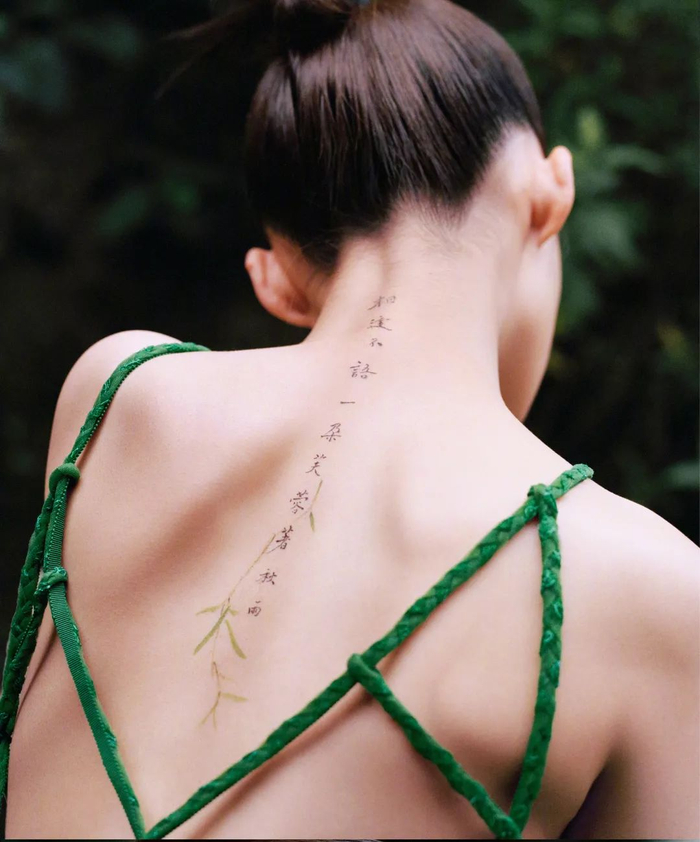 娟秀的字体落于美丽的脖颈、背上,令人舍不得移开目光。这优雅的颈部曲线和完美的背部线条,着实让小编原地心动!仙女下凡可真是辛苦了~
