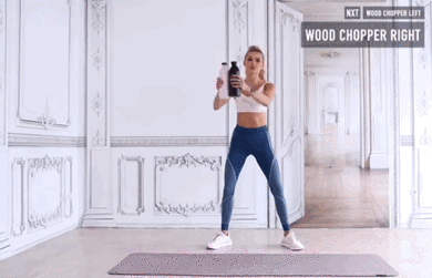 双脚打开略大于肩宽,双手拿水瓶放在一起,从左下方膝盖附近,向右上方举起,身体随着举起动作自然旋转,左右两边各做30秒。