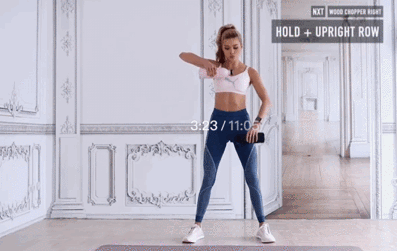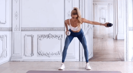 整体姿势保持不变,双手改为大臂侧平举,将大臂抬起至过了肩膀为止,做的过程中要保持好速度,抬起和放下速度尽量一致。