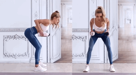 双脚打开,略大于肩宽,小腿保持直立,身体与大腿成80度左右角,背部保持直立,注意不要塌腰,双手与肩同宽自然垂下,拿住两瓶水,大臂带动小臂,双手一起向上提,做30秒。保持身体姿势不变,一只手拿着水瓶侧平举,另一只手重复相同的动作,双手各做30秒。