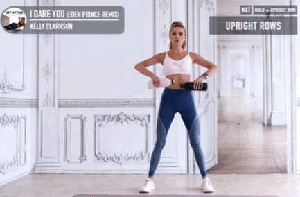 站立姿势保持不变,双手拿水瓶自然垂下,拿住水瓶,大臂向上抬至与肩膀平行,再放下,连续做30秒。