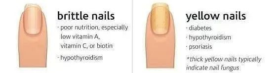 指甲发黄:有些指甲又厚又黄,通常是因为指甲内部有真菌存在,有这种情况的先要使用药物,对抗真菌等疾病。另外,指甲发黄也有可能有糖尿病或甲状腺功能减退的风险哦。