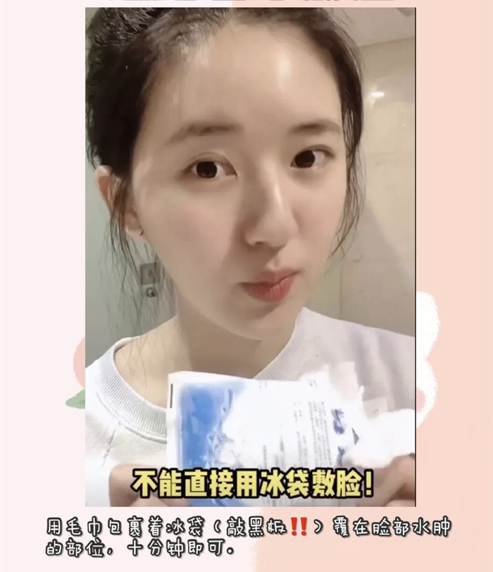 用洗脸巾把冰袋裹起来(不要直接敷哦,容易刺激皮肤)覆在脸部水肿的部位,在眼部的话,将冰袋放在眼上停留3 秒,全脸敷大概十分钟以内就可以了。
