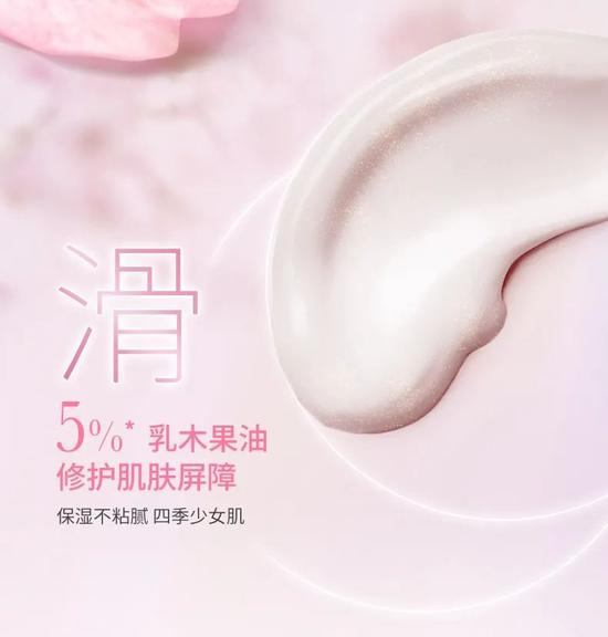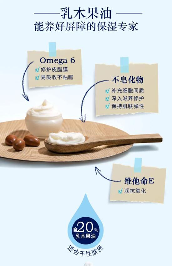 其中蕴含丰富的乳木果精粹,同时还添加牛油果油、葡萄籽油。