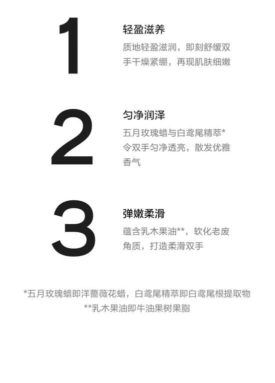 这款是乳霜质地,但涂抹在手上能够快速被吸收,手感非常细腻,不会留下黏腻感。