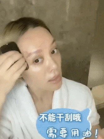 静姐选择用刮痧板来消除水肿。根据她的建议,如果姐妹们刚刚接触刮痧,刮的时候一定要把刮痧板放得比较平。眼眶周围要用力刮,感觉到痛的地方就代表有淤堵,需要用力来回拨,ps:刮痧一定要用油哦~