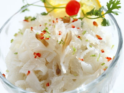 原料:天然魔芋食品 400.0g、辣椒10.0g、小葱 10.0g、大蒜 5.0g、葵花籽油 10.0g、干豇豆15.0g、饮用水 30.0g