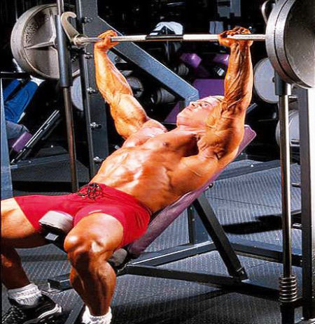 仰卧杠铃臂屈伸:该动作的要点是,在杠铃朝头顶缓慢下落时要保持上臂不动,把纲领抬起时,不要让手臂垂直与地面,而是向头的方向率为倾斜成一定角度。仰卧在躺椅上时双脚要平贴地面。