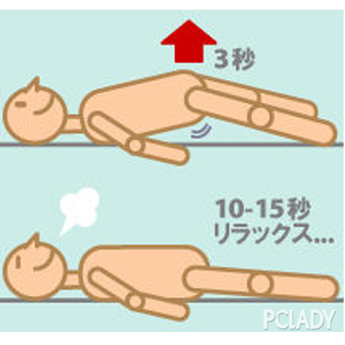 向上平躺,双腿向上抬起,用双手支撑身体,腰臀部向上抬起。上抬动作持续3秒,臀部落下平躺放松10~15秒。