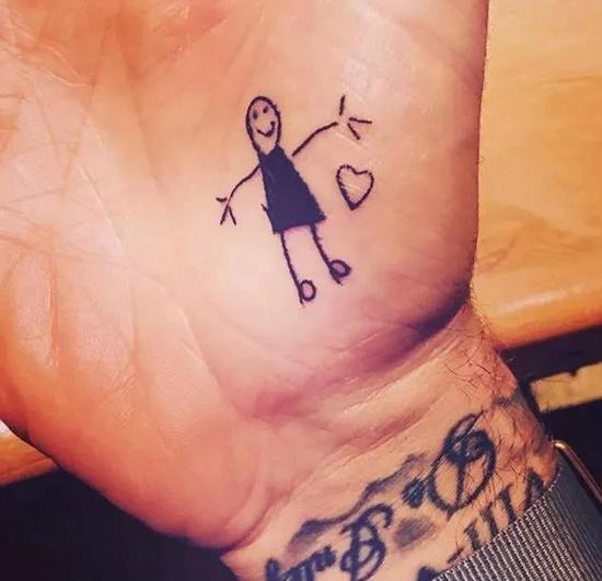 最让人好笑又感动的是,小贝居然还把小七即兴涂鸦的一个火柴人刻在了掌心。很拙劣的画,却可爱极了,也许他是想把女儿的那份会逐渐消失的童真永远珍藏起来吧。