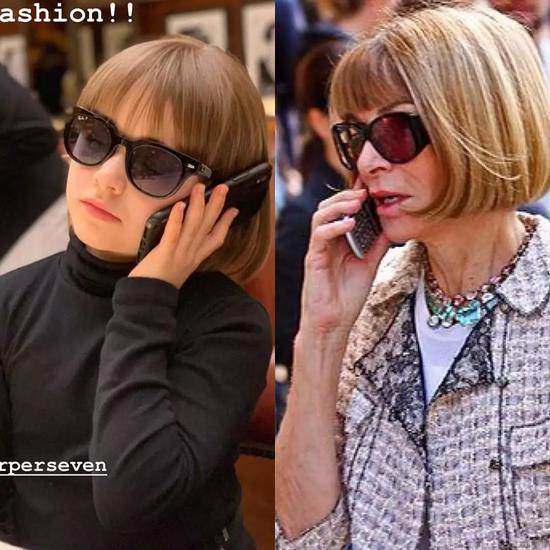 转眼间,就已经是个7岁的小姑娘了,眉眼间愈发有父母的神采。和女魔头Anna Wintour同框,除了发型相似,气场也完全不输半分。