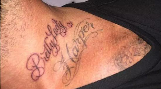 小七刚出生时,他就在锁骨的位置刻了“harper”的名字,后来又追加的“pretty lady”的字样,寓意着对小七的美好祝愿。