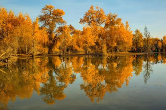 野生的胡杨林长在塔里木河畔,每到秋天便层林尽染,美不胜收。