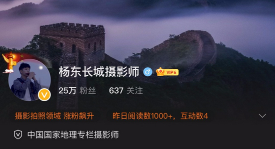他的绝美长城照,去年还一度登上微博热搜,曾达到单日1.5亿阅读量。