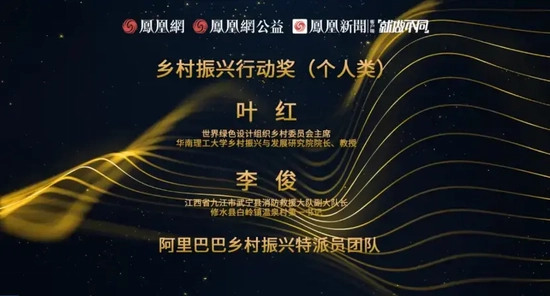 世界绿色设计组织乡村委员会主席,华南理工大学乡村振兴与发展研究院院长、教授叶红;江西省九江市武宁县消防救援大队副大队长、修水县白岭镇温泉村书记李俊;阿里巴巴乡村振兴特派员团队获得乡村振兴行动奖(个人类)。