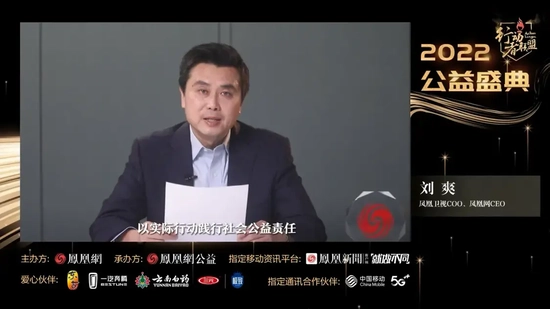 凤凰卫视COO、凤凰网CEO刘爽代表主办方,发表题为《以利他之心,回归社会理性期待》的致辞。他回顾了过去一年的大事件和频繁被讨论的公益主题热词,介绍凤凰网在捍卫事实真相、凝聚国际共识的同时,主动融入社会大局,以实际行动践行社会公益责任。比如,通过栏目的数百篇新闻报道,用全球化视角,审慎客观地分析世界各国的医疗体系以及防疫政策,提醒公众放眼世界,扩大人们的视野和认知格局;整合多元参与和跨界协同,汇聚产品、技术、解决方案的力量,推动可持续社会价值的落地与创新;将目光放至更辽阔的疆域,让山川收纳千年非遗之美,聆听刚柔相济的女性声音,见证大国重器的勃发力量。