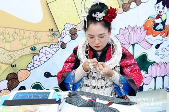 活动现场以“梦想工坊”单元的形式展示了布糊画、掇花绣、汴绣、竹编、马尾绣、农民画、扎染、苗绣、傣锦等非遗手工艺,来自贵州、云南、河南、河北等地的8位“天才妈妈”身着民族特色和具有非遗元素的服装,带着工坊的典藏作品、服饰、创新作品来到现场,展示非遗技艺,让公众沉浸式体验非遗文化。