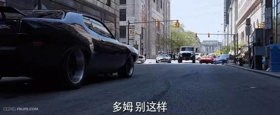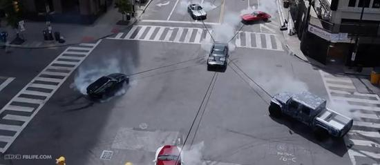 而在这个镜头中,唐老大开着台普利茅斯Plymouth GTX,前队友们分别开着雪佛兰Chevrolet Corvette Sting Ray、奔驰AMG GT、宾利欧陆GT、捷豹 F-type甚至还有军用International MXT装甲。几辆车对唐老大进行围殴,纽约街头上演“五车分尸”。