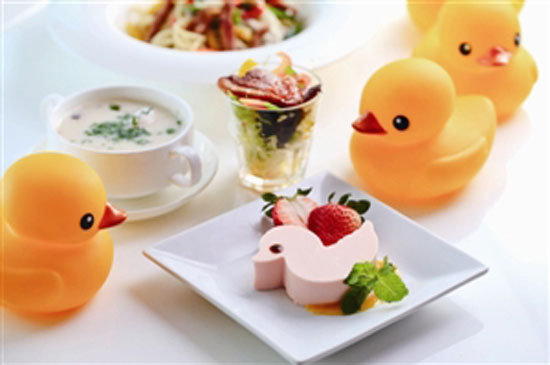 挤进熙熙攘攘的人群赏鸭自然要费不少体力,当然要吃点好吃的慰劳慰劳自己啦。为了呼应大黄鸭香港之旅,在大黄鸭停留香港期间,海港城内多家食肆都推出以黄色橡皮鸭为主题的精选食物。包括AI MOIO及BLT Steak推出的小鸭曲奇饼;Bo-lo&0#39;GNE Cafe and Bar推出的黄色小鸭意粉餐及黄色鸭仔包;马哥孛罗咖啡厅于自助午餐及自助晚餐时段推出的橡皮鸭甜品;Paul Lafayet推出的鸭仔马卡龙;士多啤梨甜品餐厅推出的小鸭甜点和鸿星海鲜酒家推出的丑小鸭点心等,不仅应景而且美味诱人。