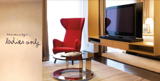 中东首家推出女性专用楼层的酒店,该酒店的女性楼层位于酒店第40层,是与知名香水品牌“肖邦”(Chopard)联手打造的精品。该女性楼层除了奉行“男士免入”的政策和提供全女性服务人员来确保安全外,还有一系列女性独享的服务。如在客房配备定制的羽绒缎面布草,洗浴用品采用“肖邦精选系列”,另外配有专用的化妆品冰箱、化妆镜、厚绒化妆浴袍和经典和式晨服,为客人创设出一个完全如家的氛围。
