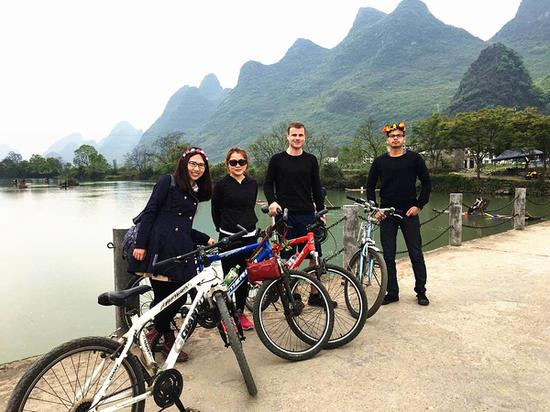 A:虽说中国应该是我的主场,但不太会说中国话却几近环游了大半个中国的Luis简直是旅行达人,他有一本详细的计划本,圈画出了所有的路线,我只负责跟在后面做个临时小翻译和小跟班就行了。因为和我原本的路线计划不同,我只能在出发当时临时预定新路线会经过的客栈,然后租上自行车,从阳朔骑到漓江最大的支流——遇龙河,再沿着遇龙河一路北上。这条经典骑行路线上的十里画廊确实风景如画,一路都是千年的古木和造型奇特的青山。我们还在路上遇到了来自新加坡的健身狂热爱好者Lyn和她的朋友们,因为行程相近,索性就结伴同游。