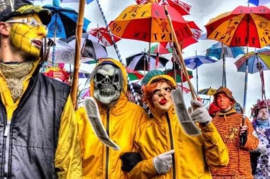 一些渔民还会穿一身传统服装,头顶花帽,脸涂油彩,肩披羽巾,手执花伞,脚蹬丝袜。全城人在乐队带领下,从一个城镇连唱带跳地转到另一个城镇。