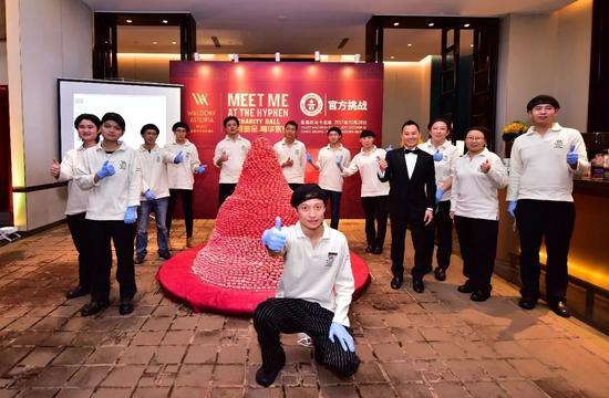 红丝绒甜品,于上世纪起源于纽约华尔道夫酒店,是华尔道夫酒店及度假村的招牌甜品之一。如今,北京华尔道夫酒店16位厨师,使用约26,000粒马卡龙,在不使用任何辅助材料的基础上,耗时12小时创造搭建一座高达1.62米的“红丝绒马卡龙塔”以挑战世界纪录;并将该红丝绒马卡龙塔在2017年度北京华尔道夫酒店慈善舞会上拍卖,将所得全部善款捐赠至儿童乐益会。此外,北京华尔道夫酒店携手儿童乐益会与北京丰台妇幼保健院,于2017年11月1日举行“不忘初心,与爱同行”活动,酒店管理层慰问住院自闭症儿童,将部分红丝绒马卡龙送至北京丰台妇幼保健医院,与小朋友一起分享红丝绒马卡龙的暖心甜蜜。